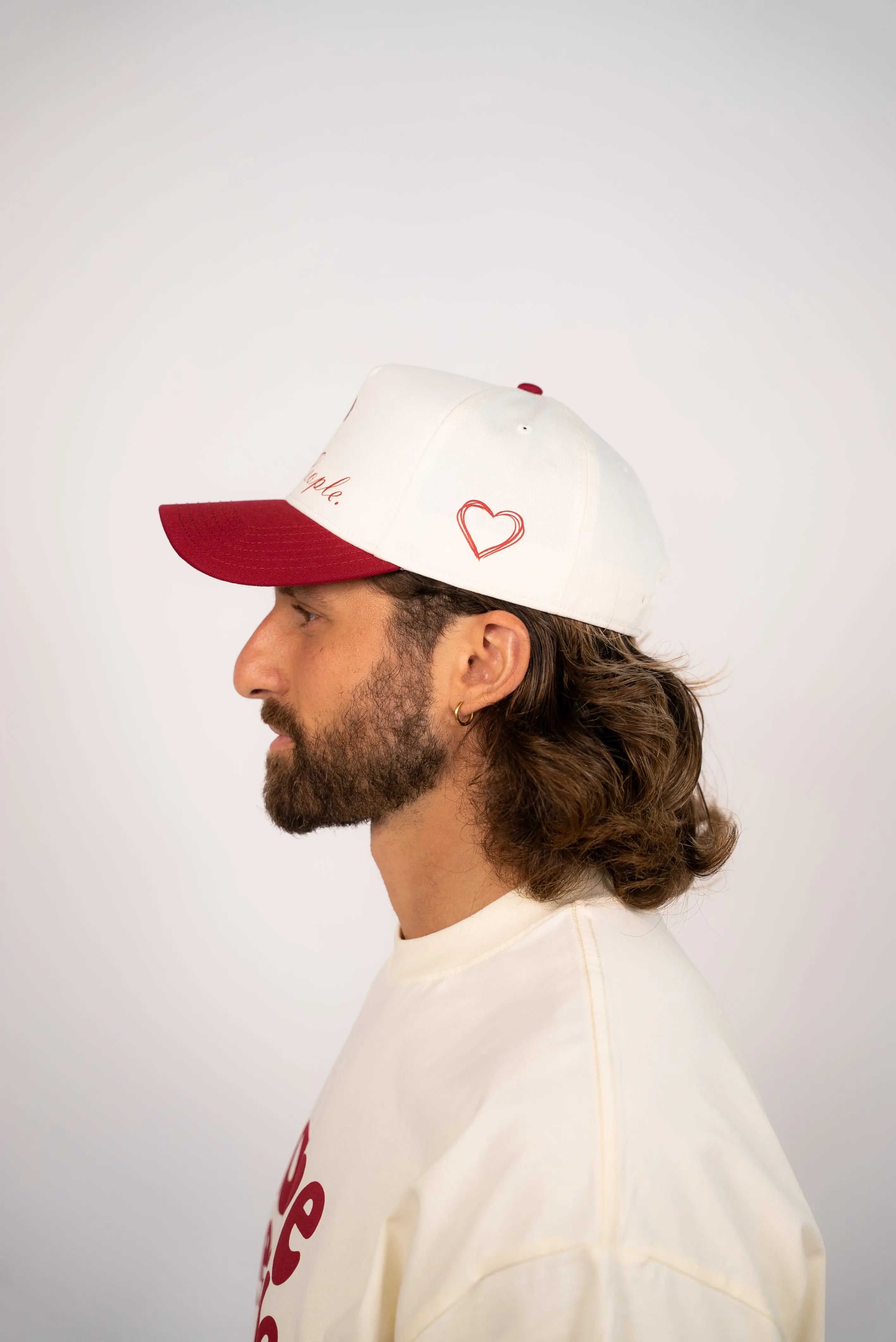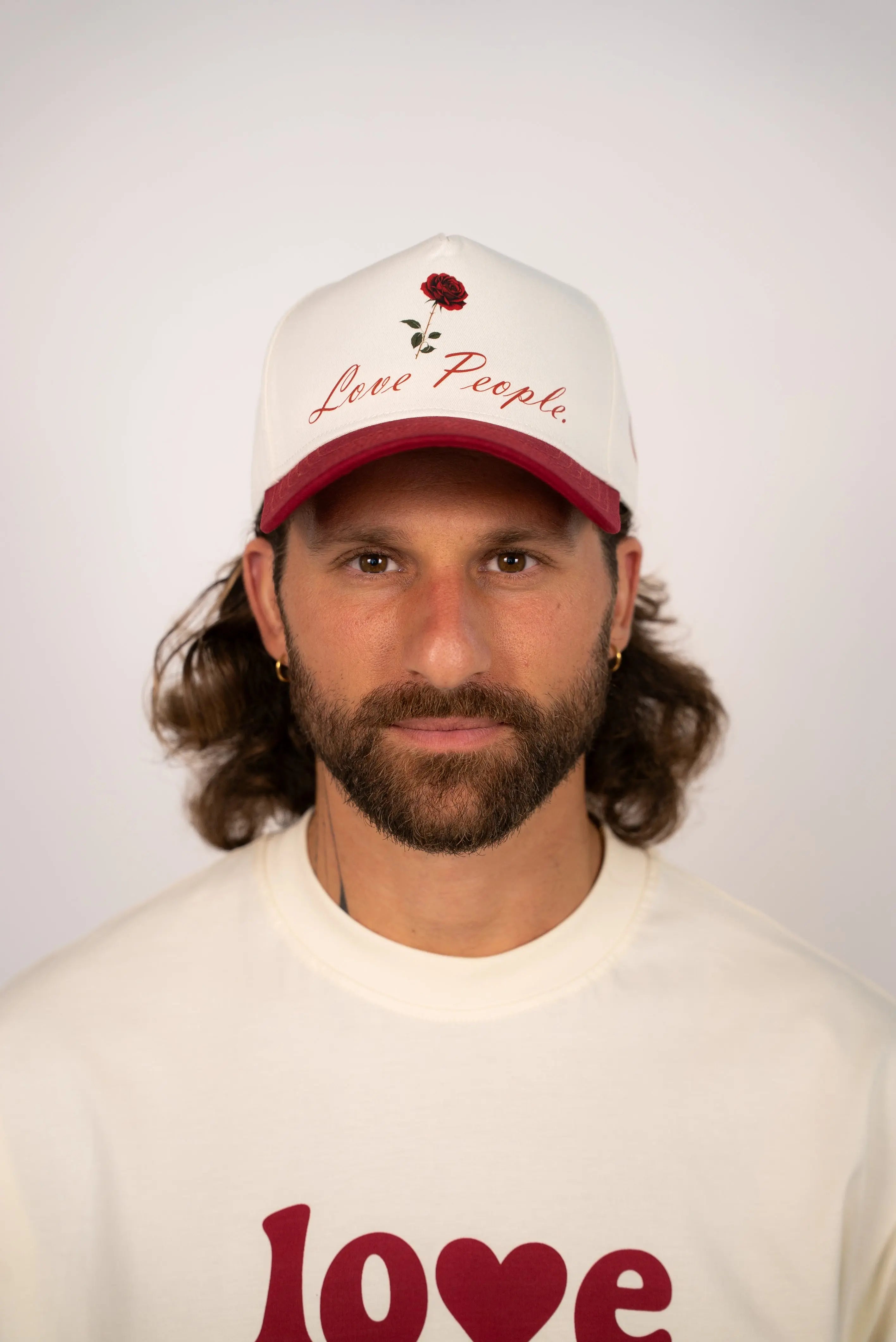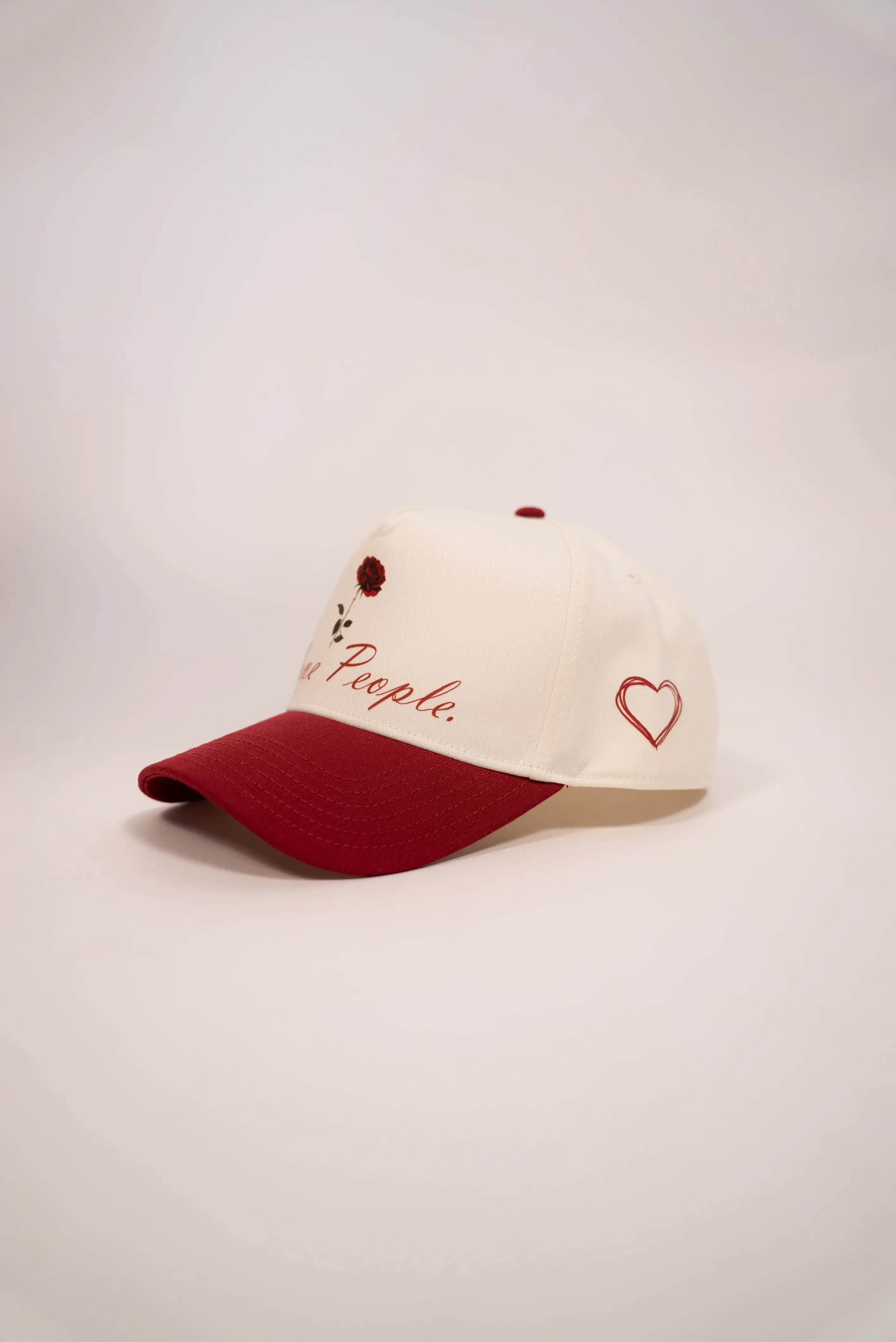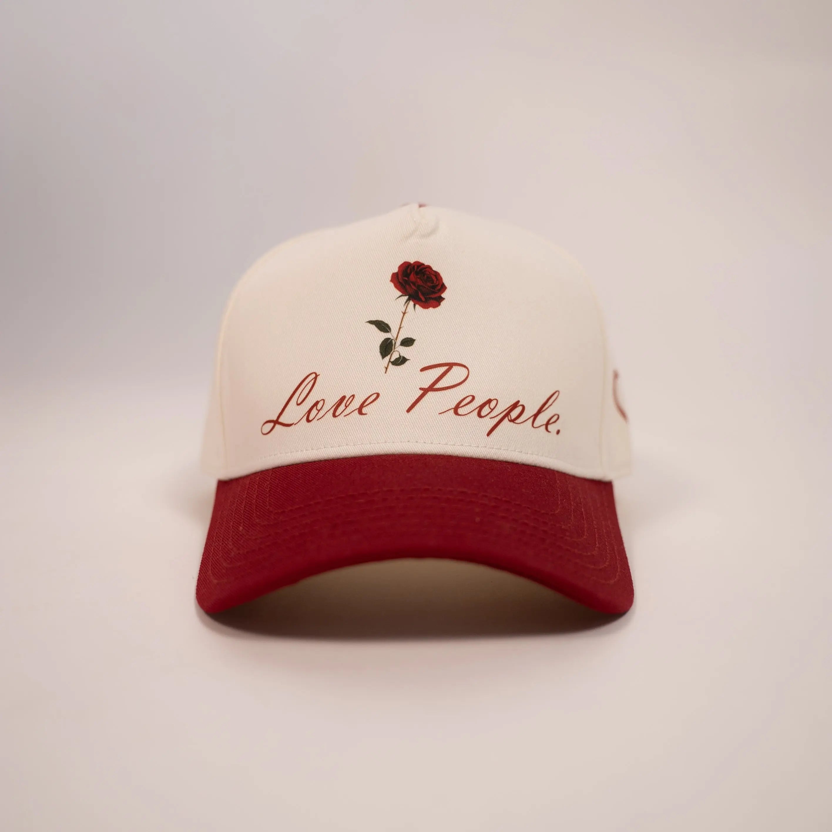 Cream Rose Hat – sleek five-panel snapback in cream cotton twill, featuring a striking red rose and “Love People” embroidery. One-size snapback with adjustable strap ensures a perfect fit. Lightweight and durable—ideal for outdoor festivals, sunshine-filled days, or everyday wear. Care: spot-clean only